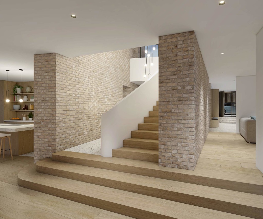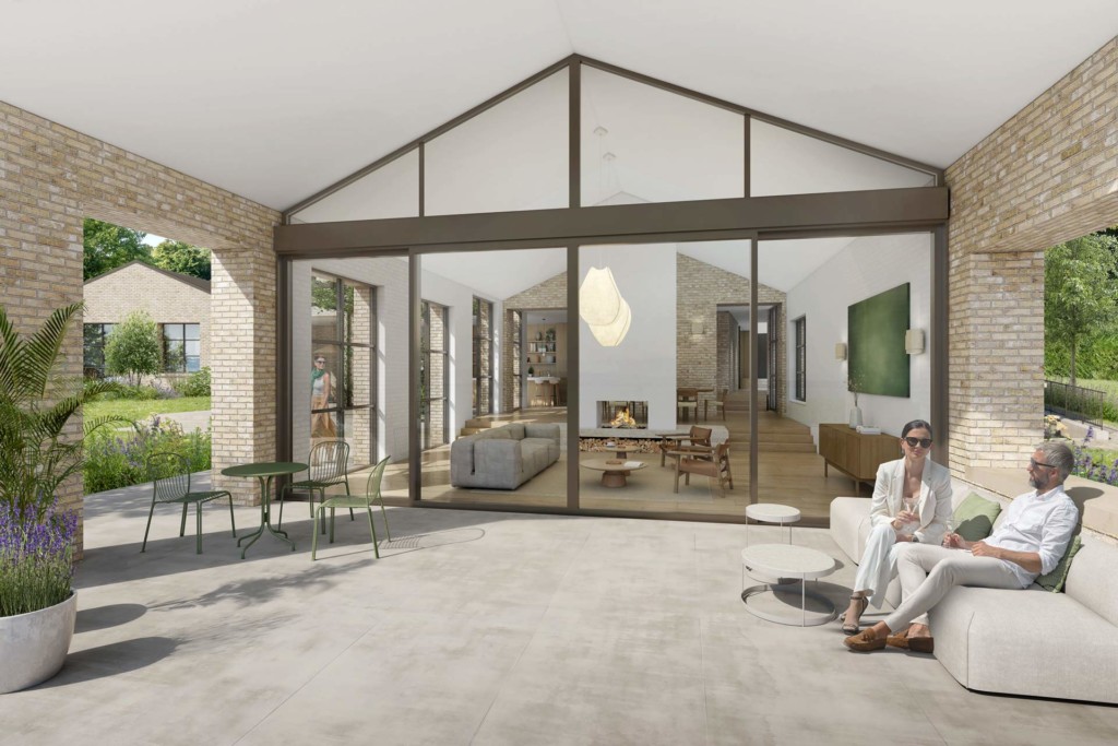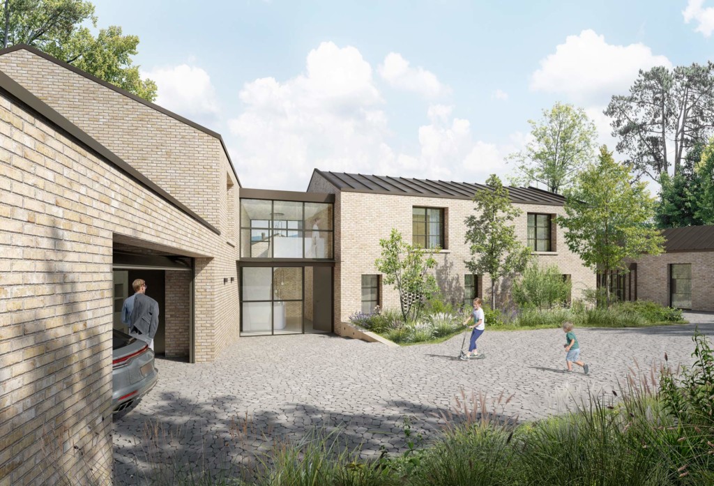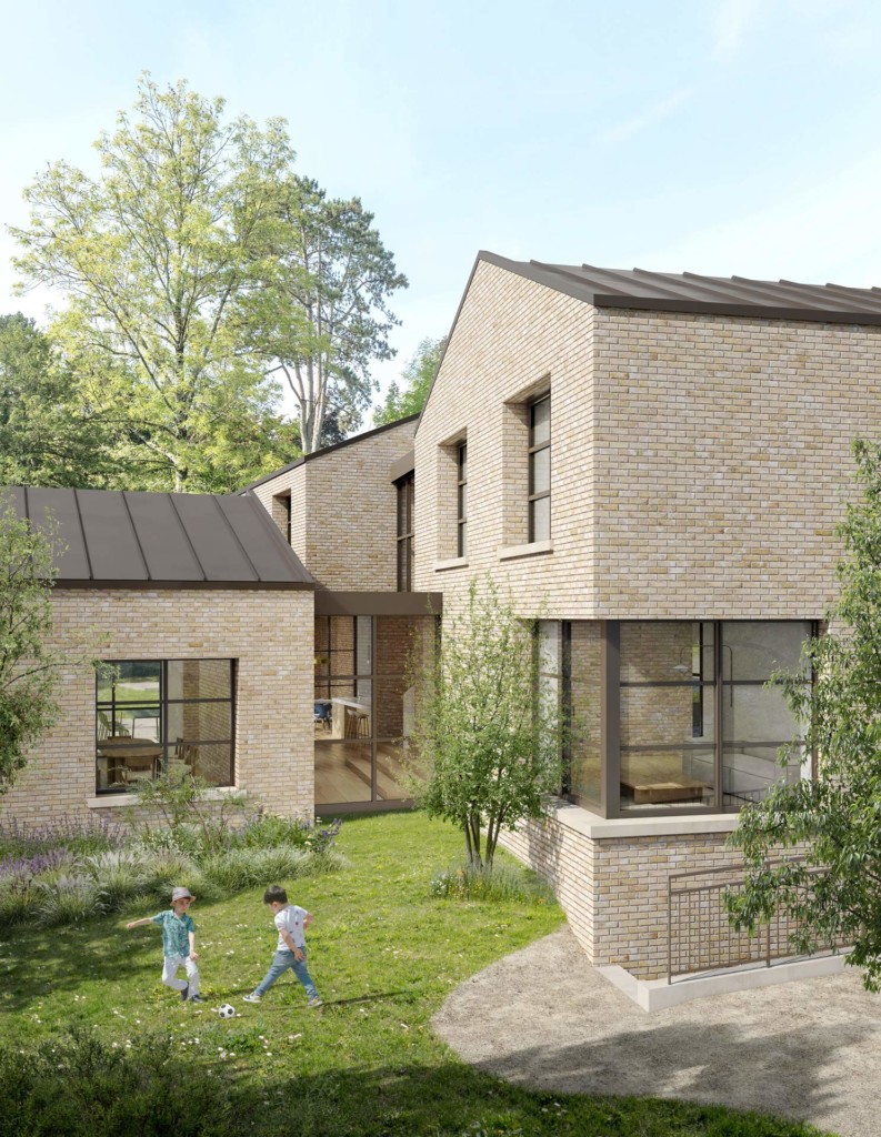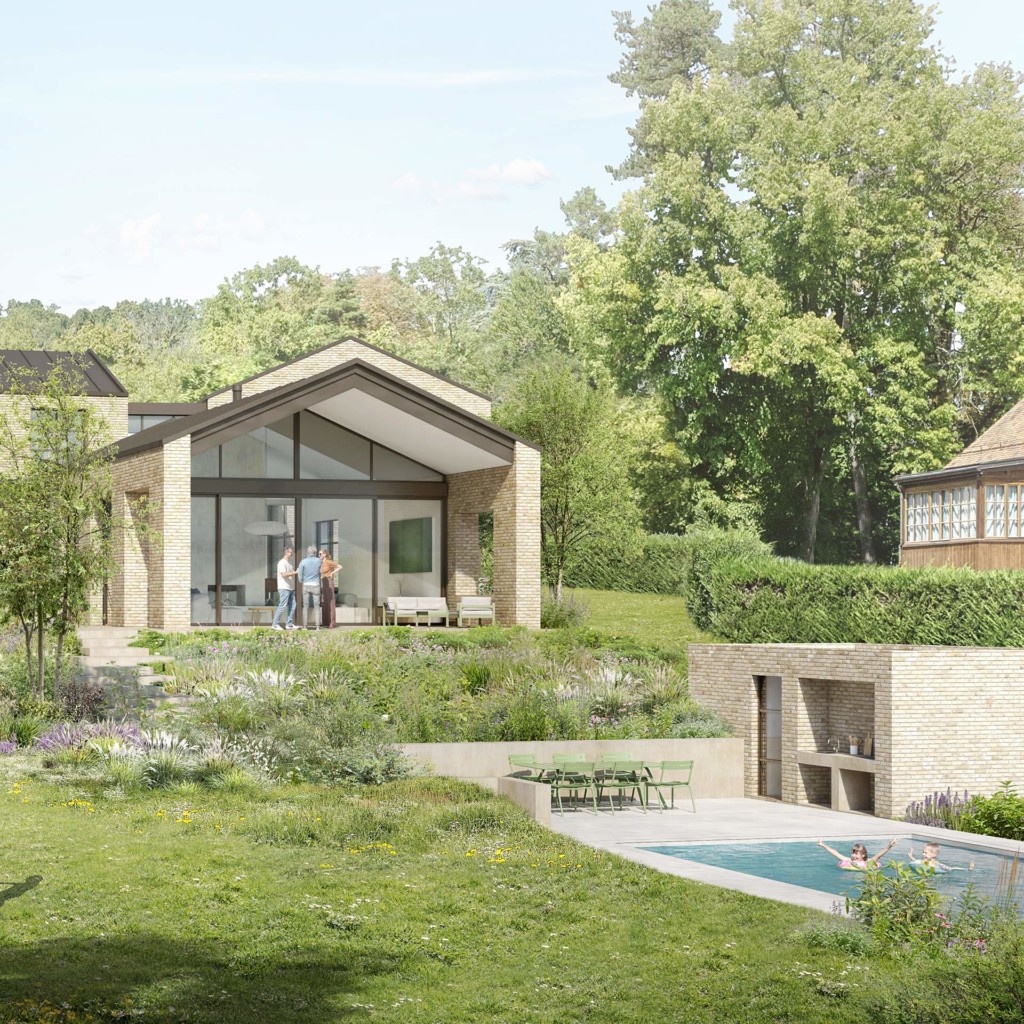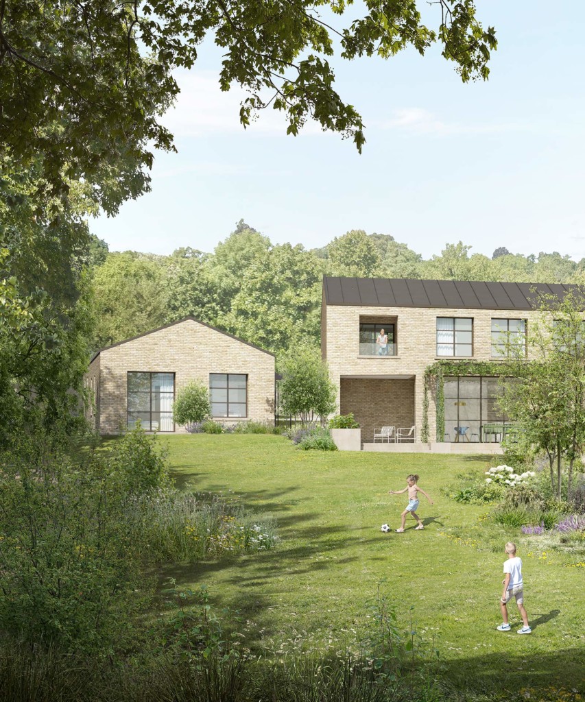 La villa est conçu comme un hameau constitué de quatre maisons. Elles sont liées entre elles par des éléments en serrurerie offrant des perspectives et transparences sur le paysage. Chaque maison s’adapte à son contexte directe tant par rapport à la topographie qu’à la vue sur le paysage