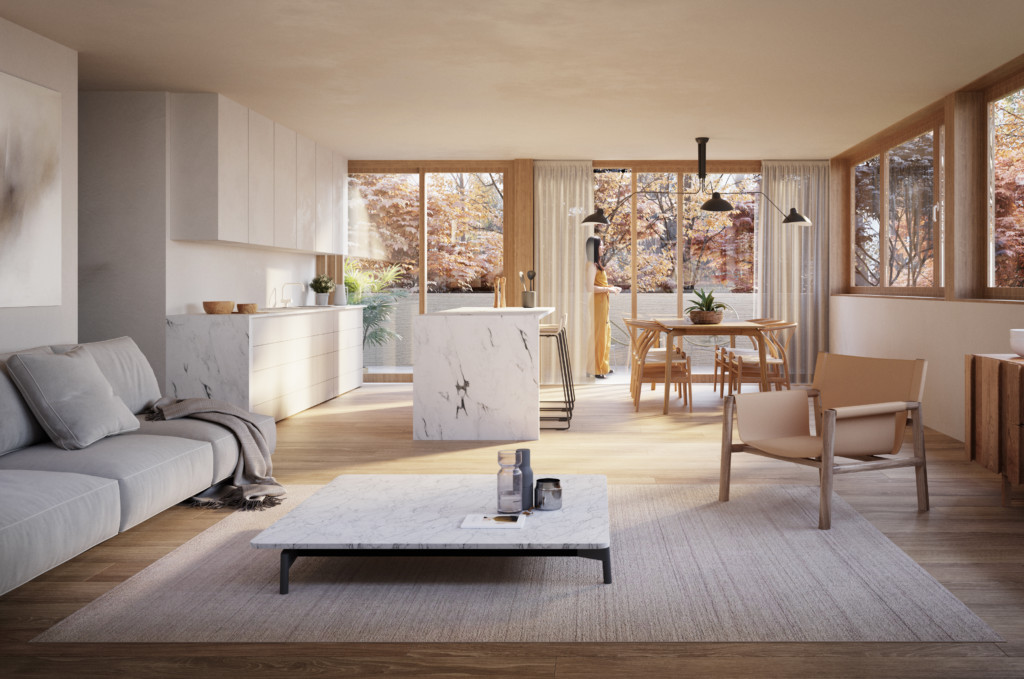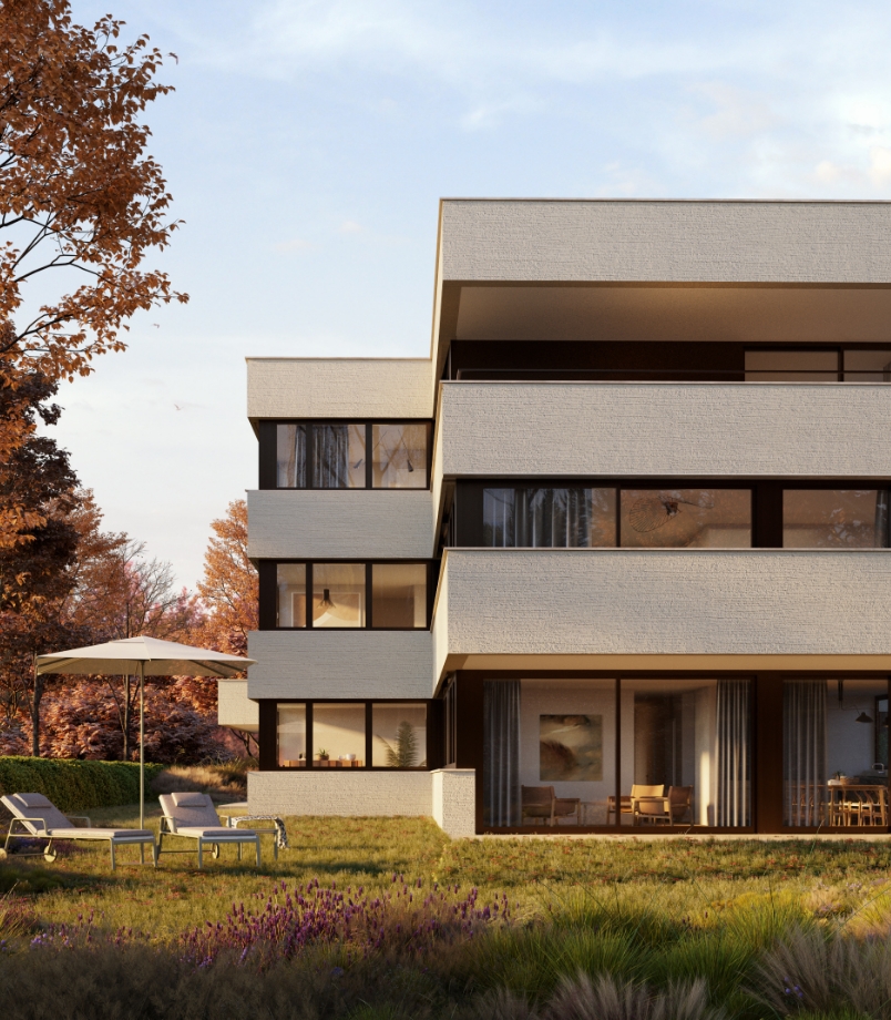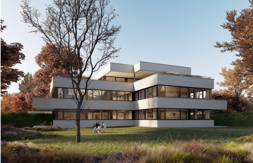 La forme en étoile de cette grande maison est propice à l’habitat groupé car elle permet à la fois une meilleure intégration morphologique dans le contexte et une diversité́ de situation pour les logements qui profitent chacun de trois orientations.