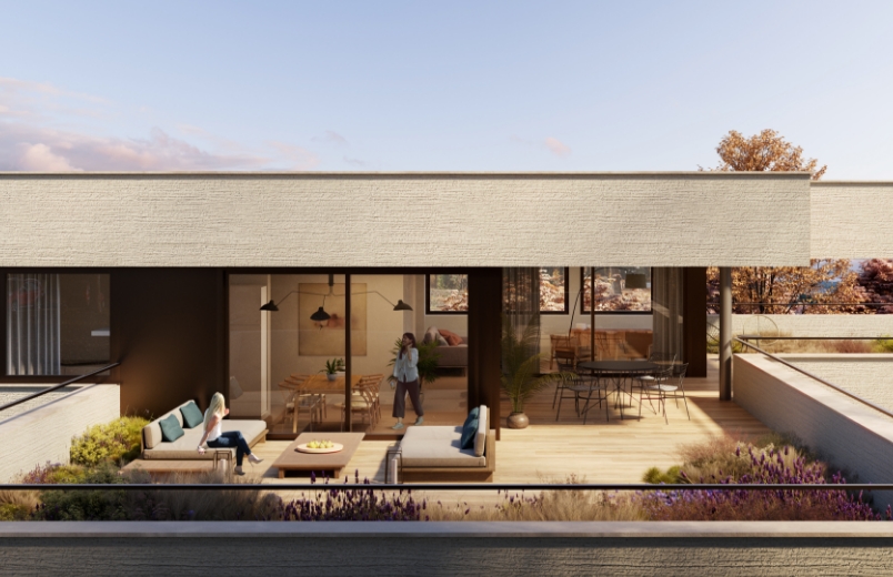 L’étage de l’attique, qui ne représente que 50% de la surface d’étage, participe à différencier les relations avec le voisinage. Le jeu sur le retrait d’attique du côté des villas permet d’organiser la relation morphologique du projet avec l’existant.