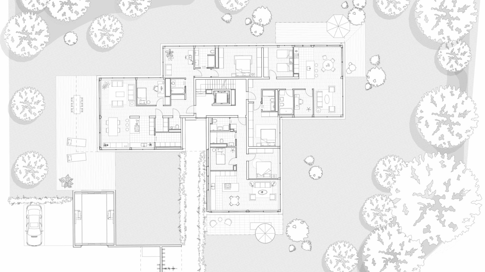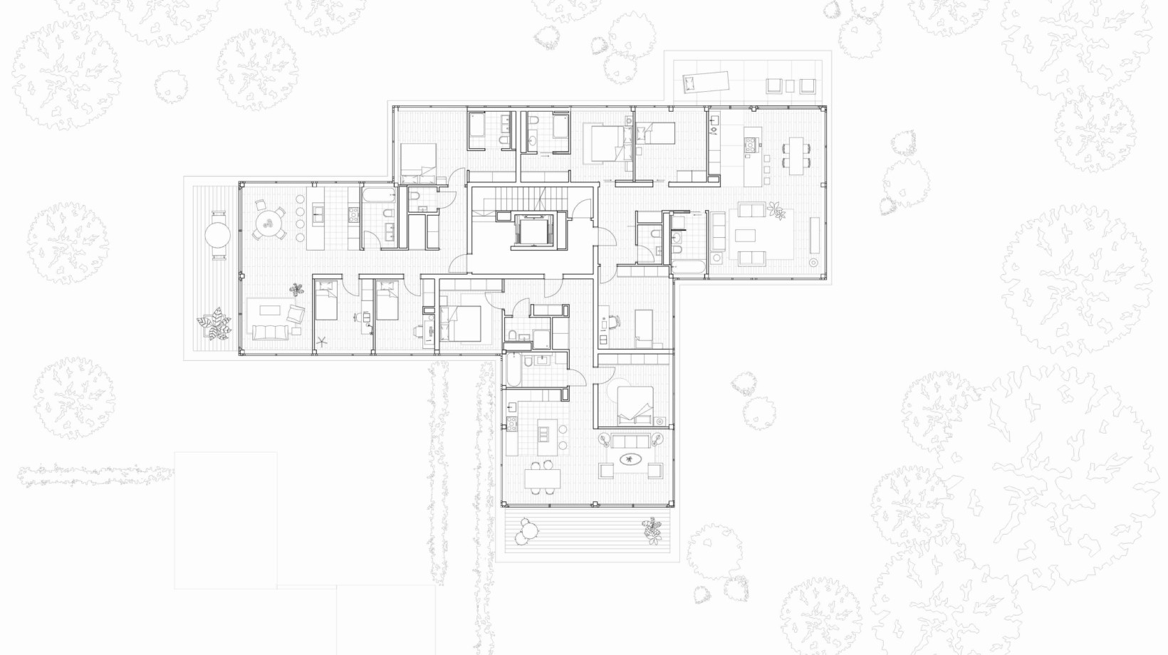 La forme en étoile de cette grande maison est propice à l’habitat groupé car elle permet à la fois une meilleure intégration morphologique dans le contexte et une diversité́ de situation pour les logements qui profitent chacun de trois orientations.