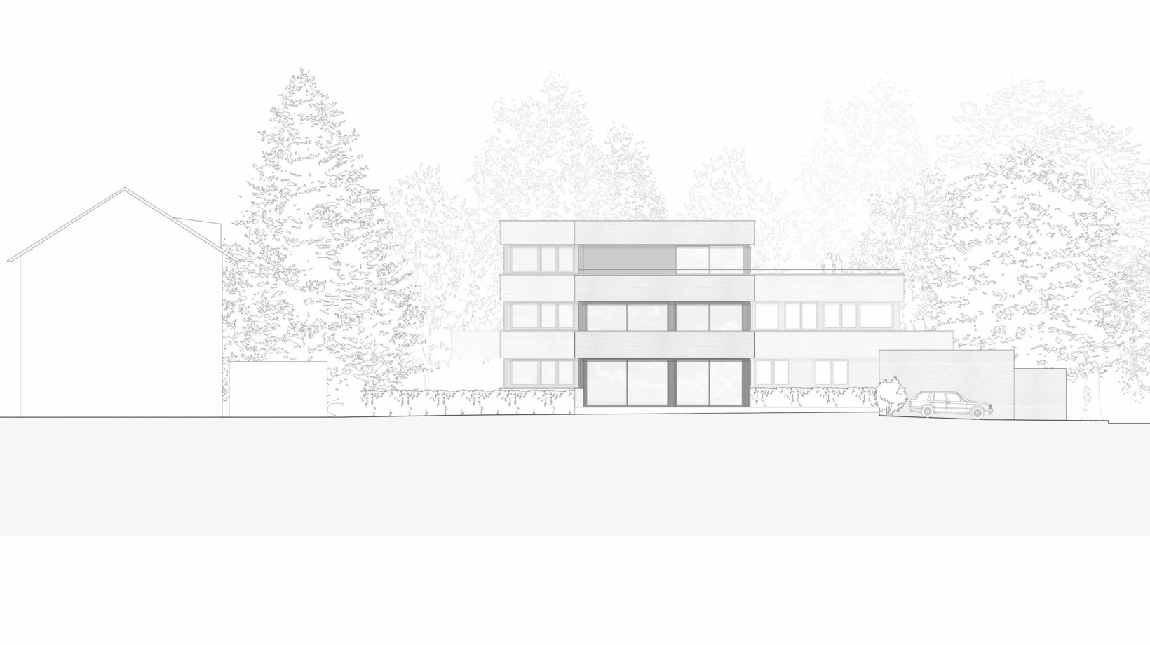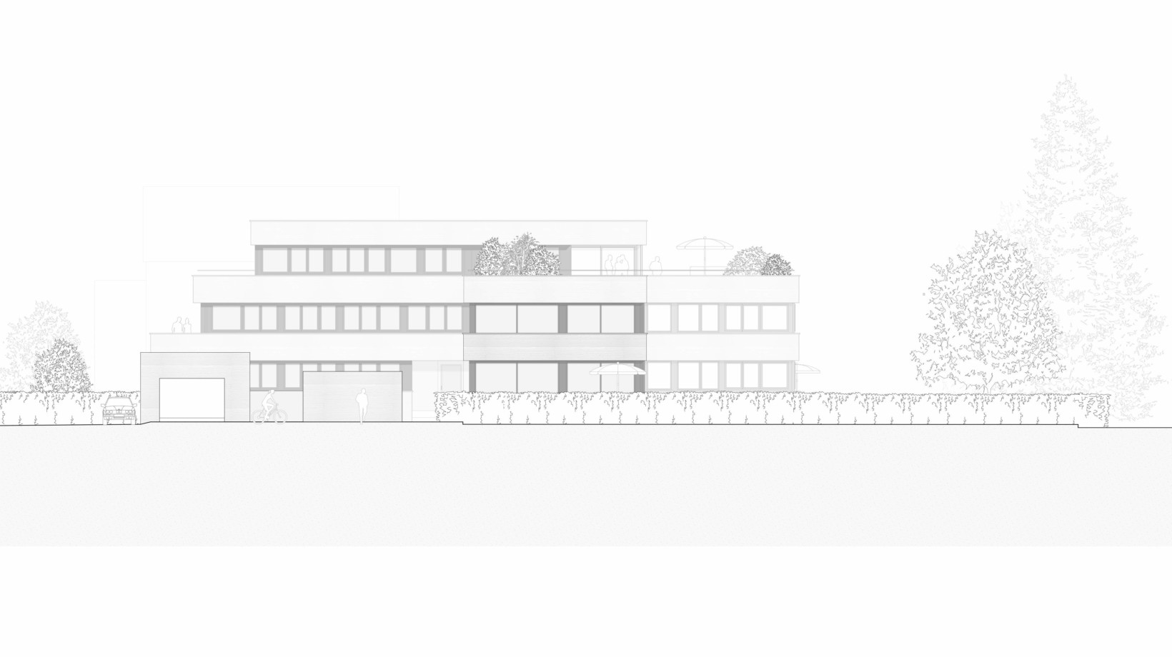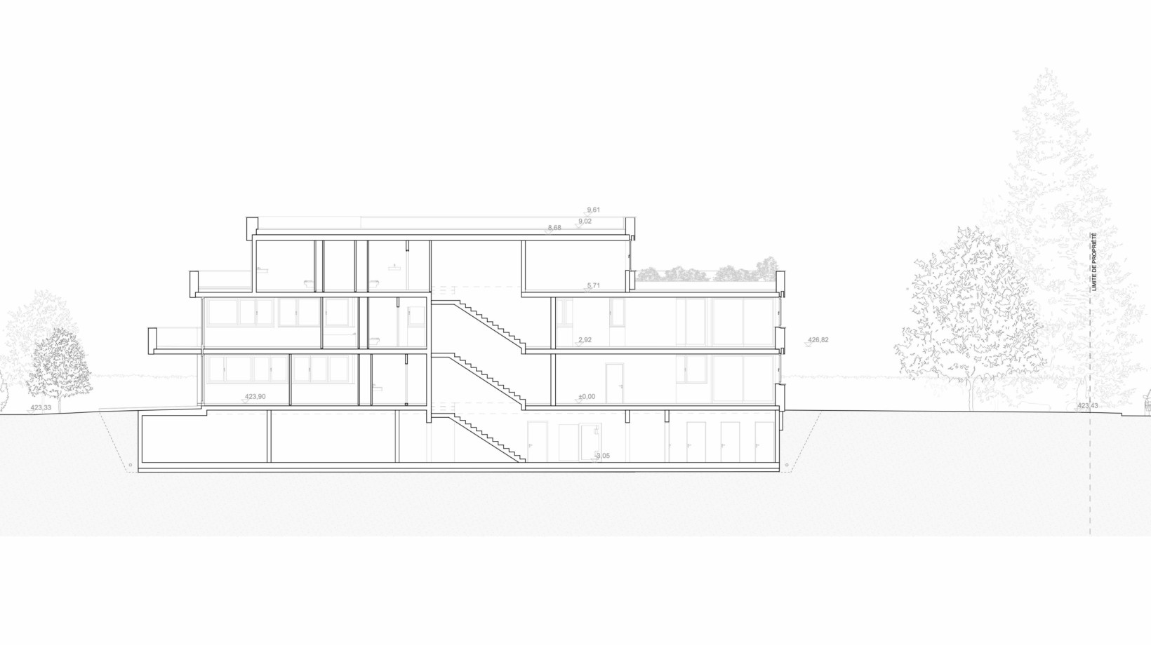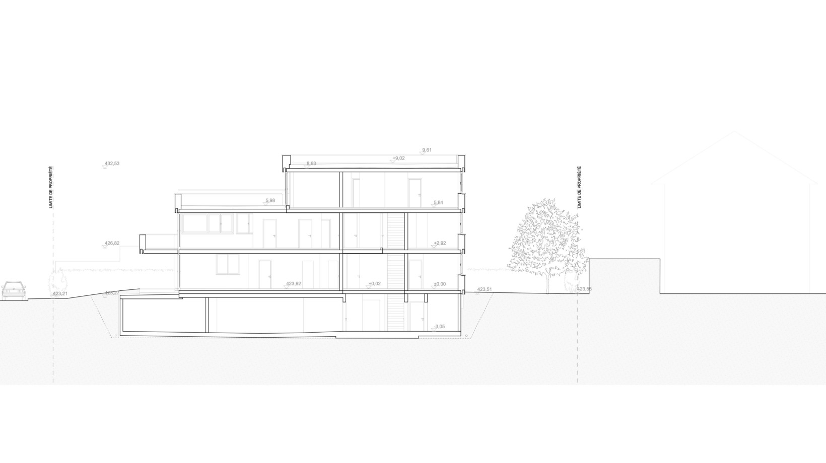 Le projet renonce au modèle de l’habitat groupé en bande qui répond à l’addition des logements par la répétition et par la mitoyenneté́. Compte tenu du contexte marqué par un tissu bâti de villas individuelles, le projet privilégie un habitat groupé ponctuel, au sein d’une grande maison, qui réunit et superpose les logements.