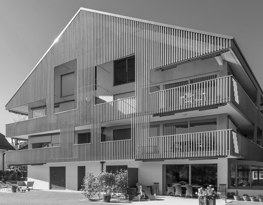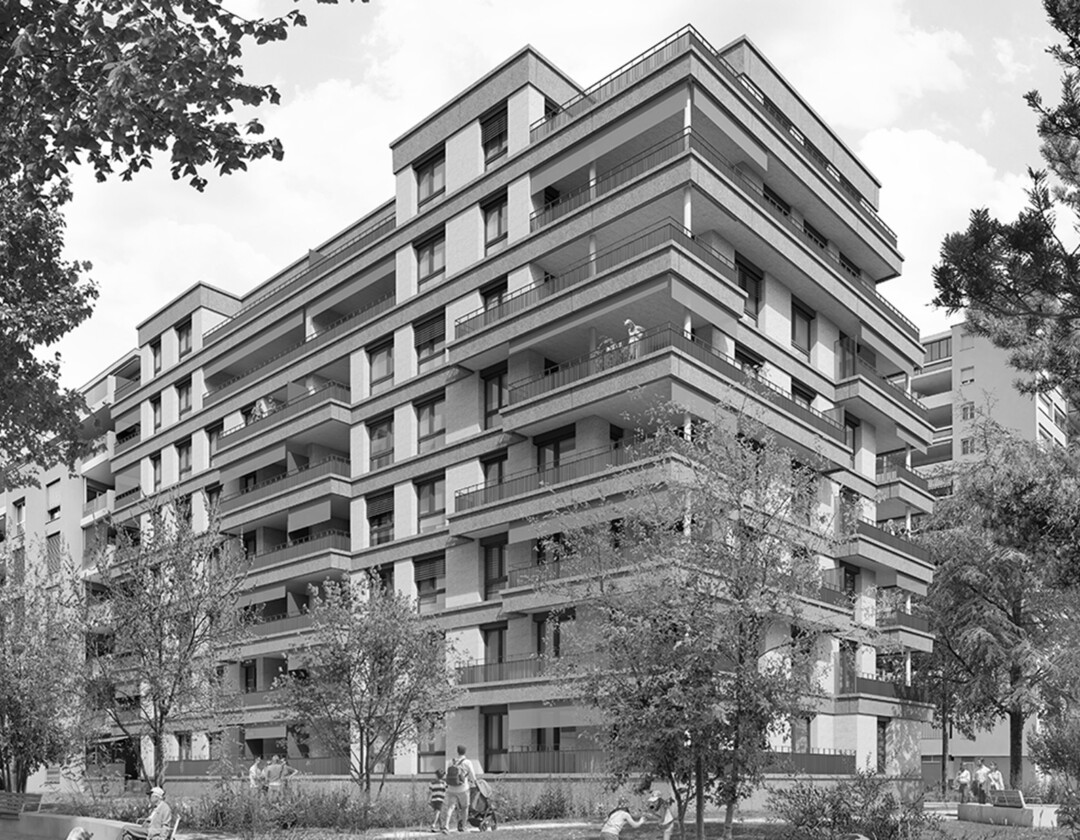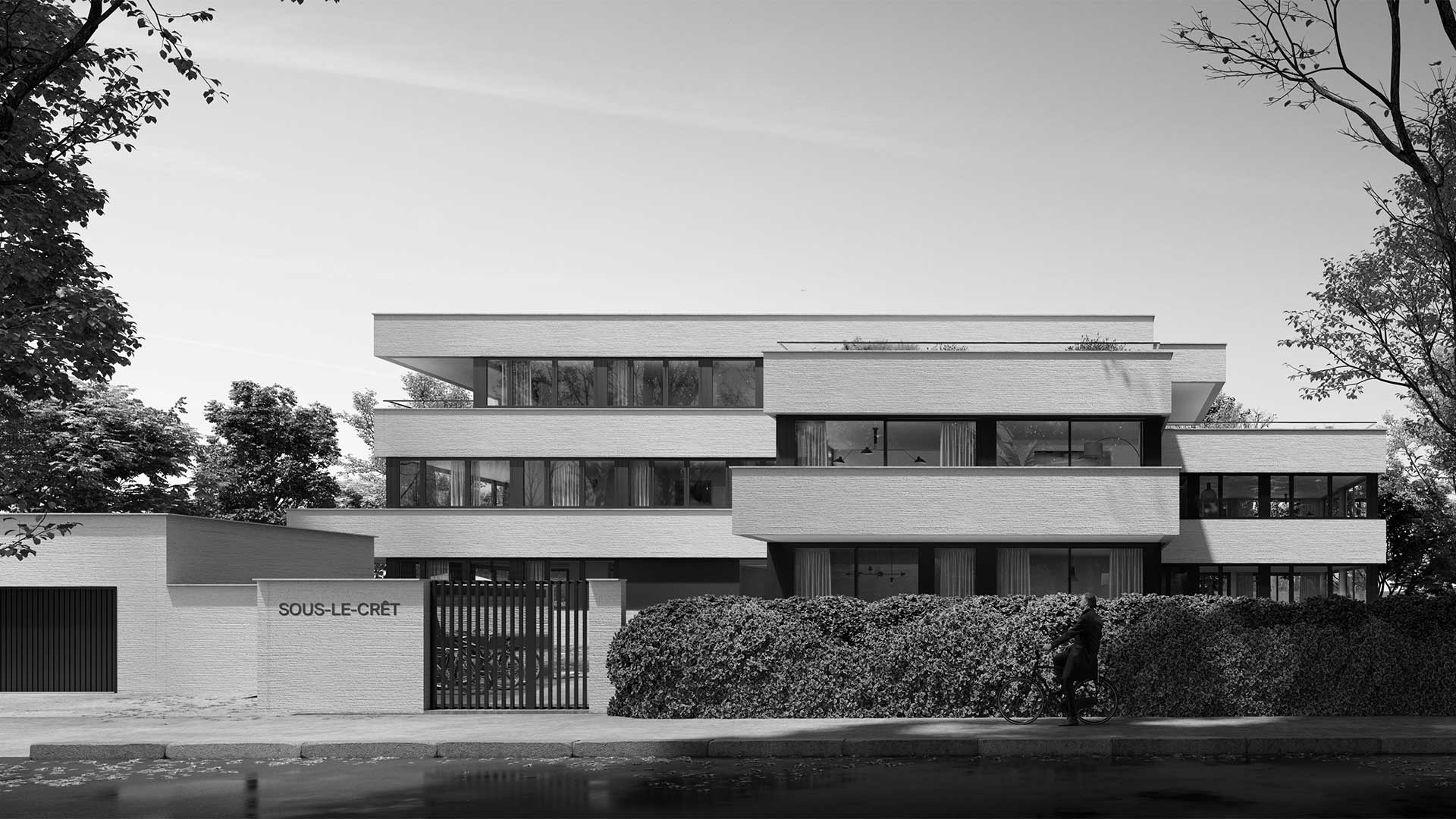 Un premier bâtiment s’installe derrière un écran végétal assurant la continuité verte sur la route de Chêne, il crée un espace de transition et participe à l’assainissement phonique de l’ensemble du site. Il accueille sur deux niveaux des activités en lien avec la proche clinique des Grangettes (salles de consultation) et quelques commerces de proximité. Cette galette est surmontée de trois bâtiments de logements qui créent un filtre sur le reste du site. L’ensemble s’articule par une place collective à la villa patrimoniale.